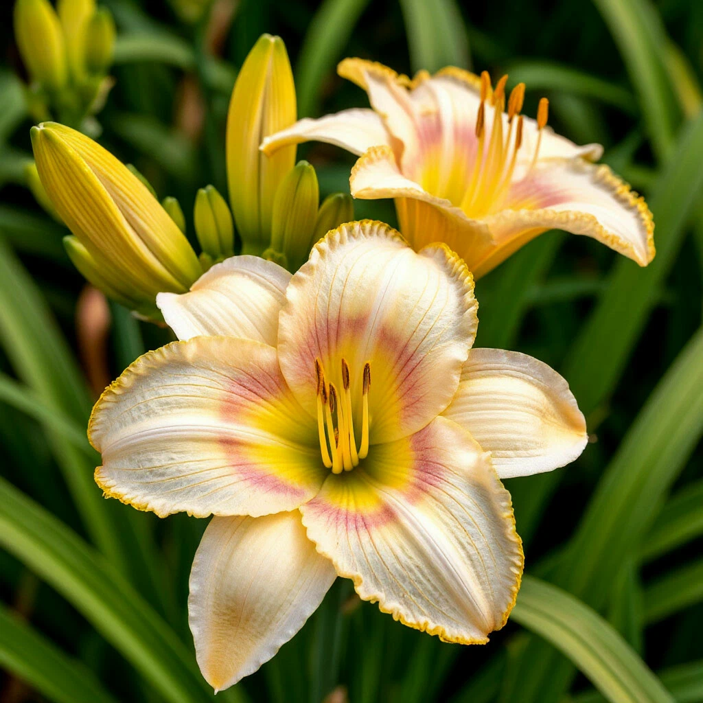 Окраска цветков лилейников поражает своим разнообразием: от нежно-кремовых и пастельных тонов до ярких красных, оранжевых, желтых, фиолетовых и даже почти черных. Часто встречаются двухцветные и многоцветные сорта с контрастными краями, полосками, глазками (окрашенное пятно в центре цветка) и другими узорами.